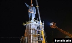 A crane lifted the 40-ton statue off its pedestal in the southeastern city of Zaporizhia on March 17 and placed it beside the plinth.
